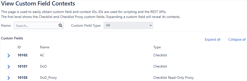 A new View Custom Field Contexts page was added to provide a quick and easy way to find the Checklist custom field and context IDs for your scripting and REST needs.