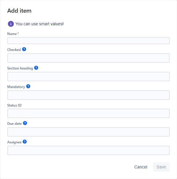 Due date | Enter a due date for the item. The date must follow ISO-8601 format. Here are some examples of working values, including smart values: