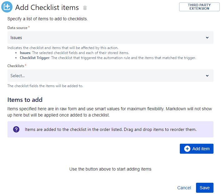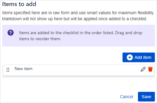 Items to add | The list of items to be added to the checklist(s). Use the + Add Item button to start adding items. Items are added to the checklist in the order listed. Drag and drop items to reorder them. |