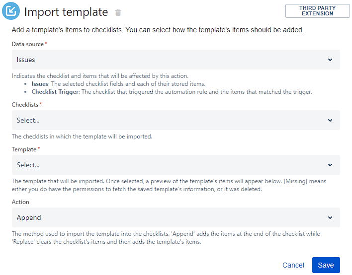 The Import template action allows you to import a template’s items to existing checklists by either appending the template’s items to the end of the checklist or replacing the checklist’s items with the template’s items.