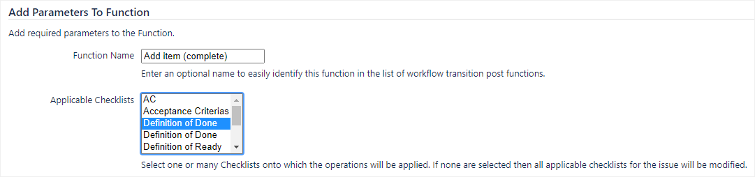 While you are configuring the post function parameters, select the checklist(s) that you want to add new items to. If you want to add new items to all checklists, do not select any checklists.