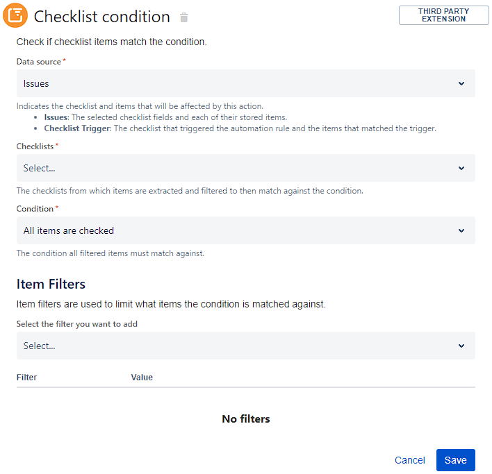 Item filters | A set of filters applied to the items obtained from the Checklists field for the current issue. This is useful for cases where you only want to match a condition to a subset of items. |