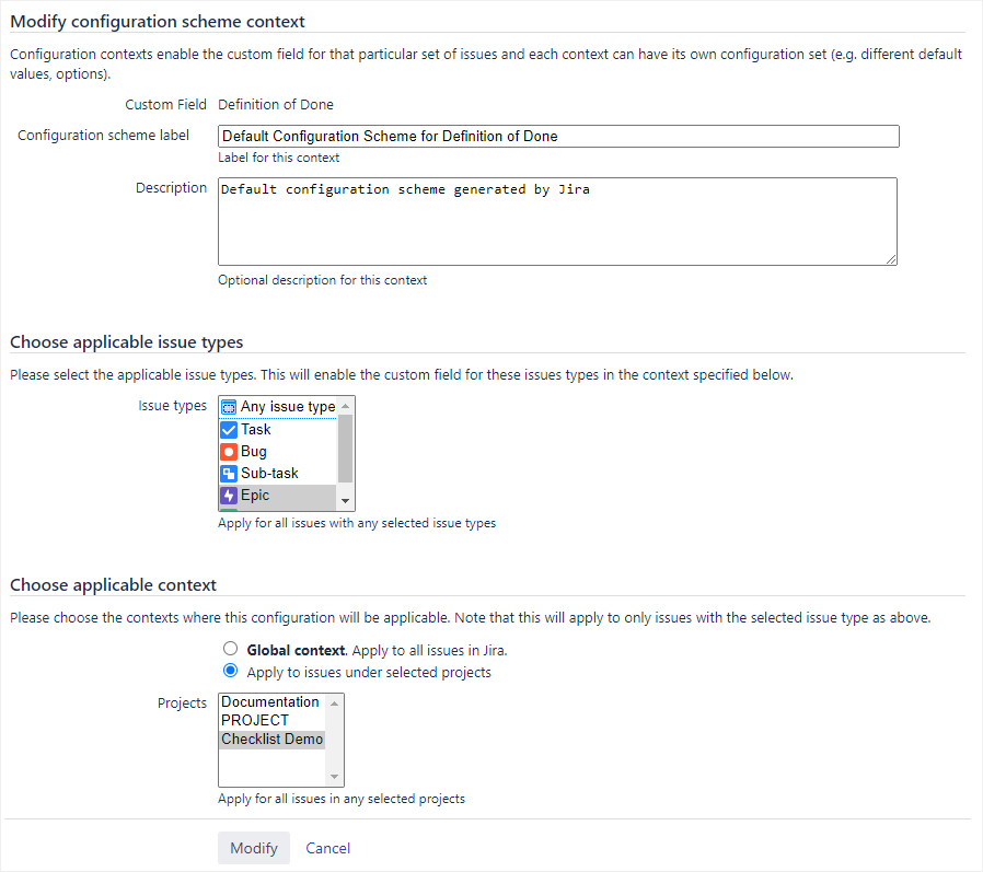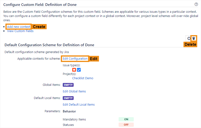 Once you have gone to the Custom fields page (see Configuring the Checklist custom field), you can create new configuration scheme contexts, edit existing ones, or delete ones that are no longer needed.