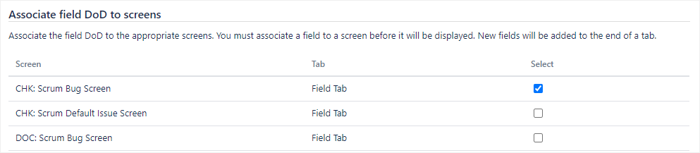 After you create each custom field, the Associate field [name] to screens page will automatically appear. Make sure to map the custom field to the correct screens and click Update.