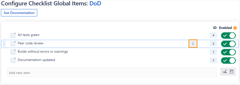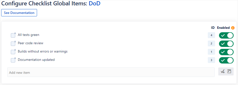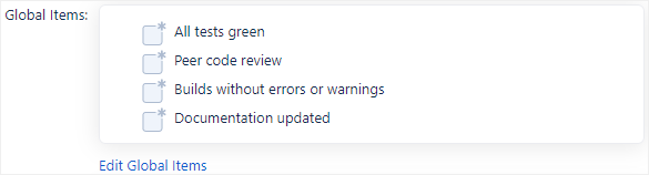 When a global item is disabled, it will no longer be visible in any issues unless it has been marked as complete. For this reason, disabling global items instead of deleting them can be an excellent way to preserve your data and track progress over in a Definition of Done (DoD) checklist. Since completed items are not removed from the system, you will still be able to trace what work has already been done.