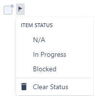 By toggling the Statuses feature, users can assign statuses to checklist items. The default statuses are N/A, In Progress, and Blocked; you can also create custom statuses.