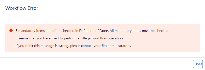 Using a Checklist Workflow Validator, you can prevent users from successfully transitioning an issue unless all mandatory items in a checklist have been checked. An error message like the following will be displayed, and the attempted workflow transition will fail.