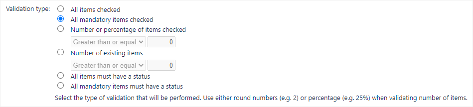 For Validation type, select All mandatory items checked. This tells the validator that it needs to confirm that all mandatory items are checked before allowing a transition to occur.