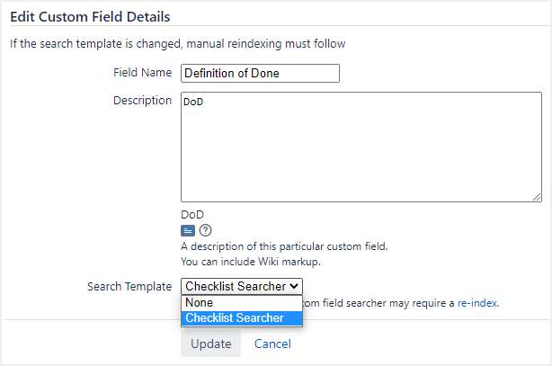 When you create a new Checklist custom field, the search template is set to Checklist Searcher by default to ensure that checklists are searchable. However, if you are running an older version of Checklist for Jira, your custom field may not have a search template set.