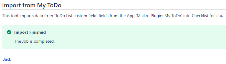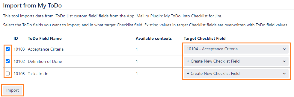 The import process lets you choose which ToDo List custom fields to import. For each ToDo List fields, you can chose to automatically create a new checklist field, or to import into an existing one.
