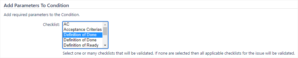 While you are configuring the condition parameters, select the checklist(s) to which the condition should be applied. If you want to apply the condition to all checklists, do not select any checklists.