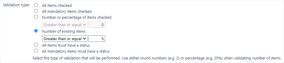 For Validation type, select Number of existing items, keep Greater than or equal, and enter the minimum number of items. This tells the condition that it needs to confirm that the checklist contains at least that many items before allowing a transition to occur.