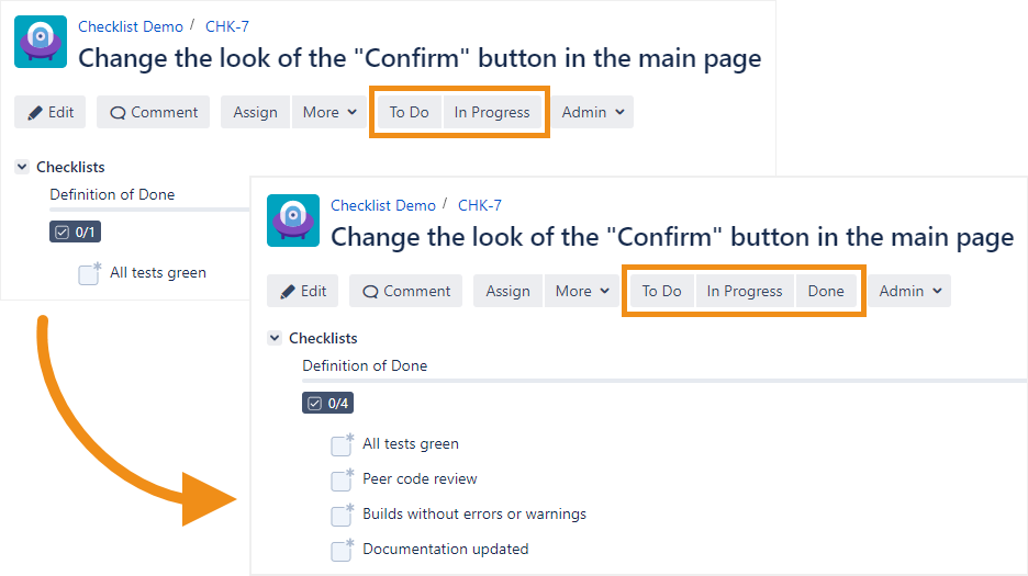 Using a Checklist Workflow Condition, you can prevent users from transitioning an issue unless a checklist contains a minimum number of items. If the checklist contains too few items, the button for that workflow transition will simply not appear.