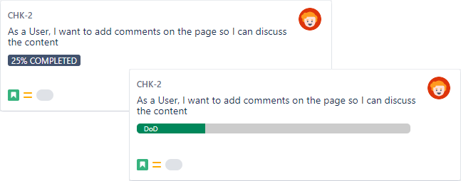 This custom field type reads the data from the Checklist custom field and displays progress information based on the status of the checklist. It can be rendered in different visual formats, such as a banner or progress bar, which is very useful on Agile cards. You can even customize the proxy to display your own text.