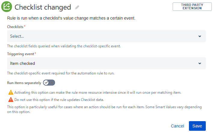The trigger will add Smart Values that can be used down the line in the automation rule. These Smart Values will always contain basic information regarding the checklist custom field the rule is run for, but the item values will either be combined or separated based on the Run items individually field.