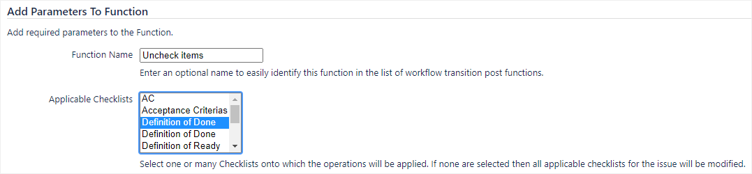 While you are configuring the post function parameters, select the checklist(s) that you want to uncheck items in. If you want to uncheck items in all checklists, do not select any checklists.