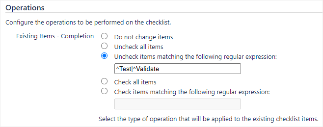 In the Operations section, for Existing Items - Completion, select Uncheck items matching the following regular expression and write the desired regular expression. The example shown below will uncheck items that start with “Test” or “Validate”: