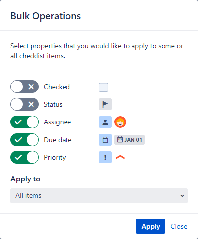 You can edit checklist items in the bulk editor, which enables you to configure various properties and apply them to many checklist items (both local and global) at once.