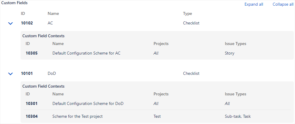 Jira provides no easy way to find the IDs of custom fields and their contexts, which are especially useful for scripting and REST APIs. To address this, we added a View Custom Field Contexts page that shows all the Checklist and Checklist Proxy custom fields, including their IDs.