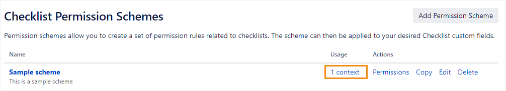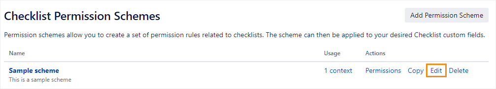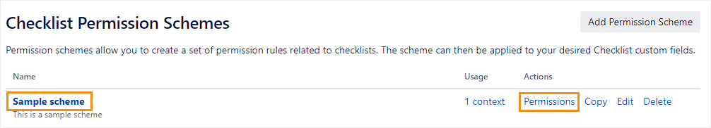 This page describes how to create and configure permission schemes. To learn how to assign a permission scheme to your checklist custom fields, see Editing permission schemes.