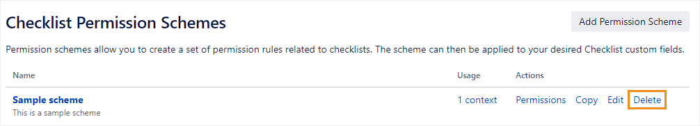 To delete a permission scheme, click Delete beside that scheme.