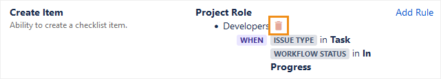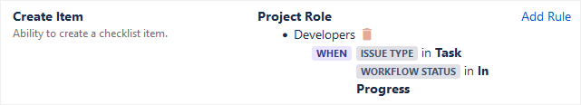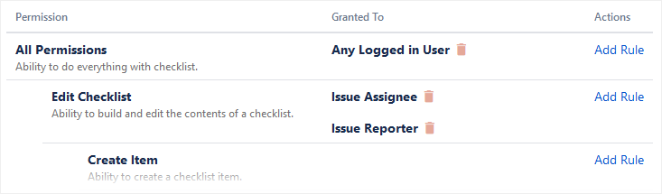 Multiple rules can be combined on a single action. For example, here’s two rules that allow both the Issue Reporter and Issue Assignee to edit checklists: