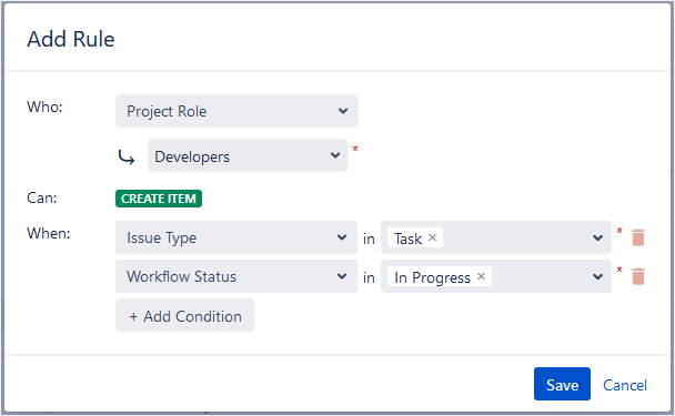 Multiple conditions can be added to a single rule. For example, here’s a rule that specifies Developers can create items only for Tasks that are In Progress:
