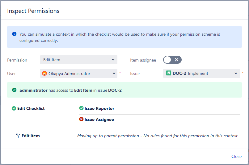 For example, let’s use the Inspect Permissions tool to evaluate the permission scheme created in the examples above. Let’s check if user Okapya Administrator can Edit Item in issue DOC-2: