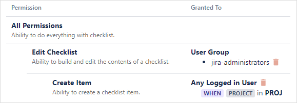 Centralized permission schemes let you design your permissions once and re-use them across multiple Checklist fields or configuration field contexts.