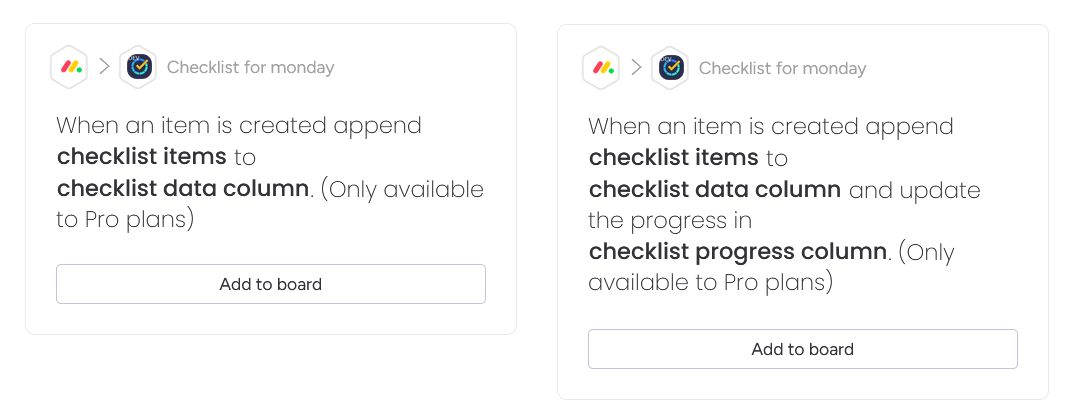 If you find yourself creating the same checklist items over and over, you may want to automate that task. Two of the pre-existing recipes let you automatically add checklist items to every new monday item that gets created (see Integration).
