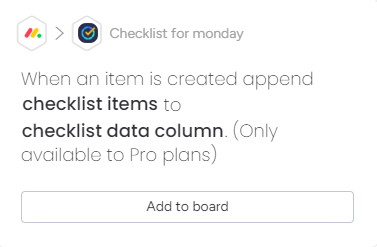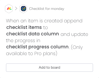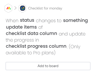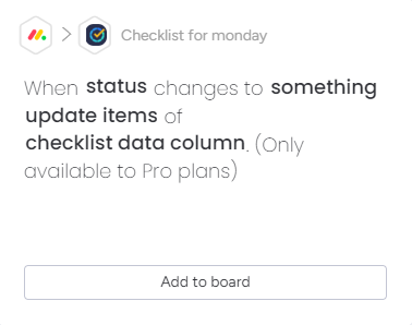 Integration uses pre-existing automation recipes that come with Checklist for monday. These recipes allow you to automate the most common checklist actions, without needing to build your own recipe.