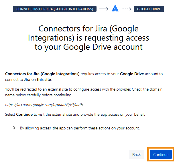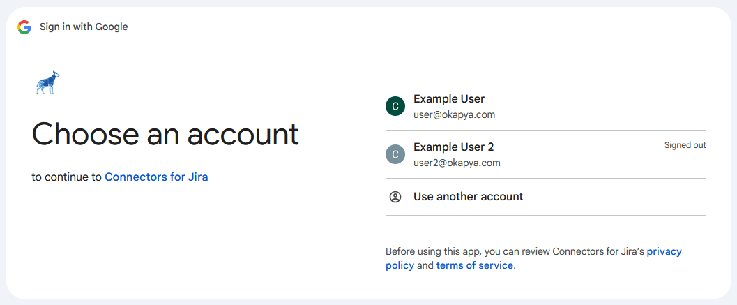 In the Google sign-in window, you’ll see a message explaining what information will be shared with Connectors for Jira. We recommend reviewing these details before you click Continue.