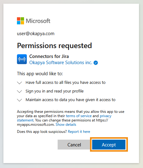 You'll then see the list of permissions required by Connectors for Jira. We recommend reviewing these details before you click Accept.